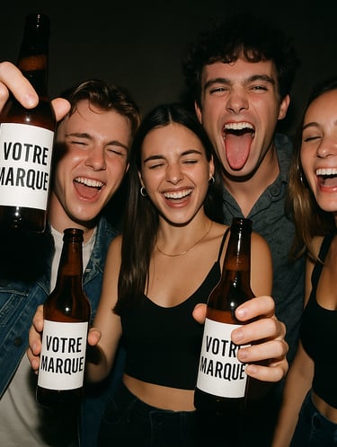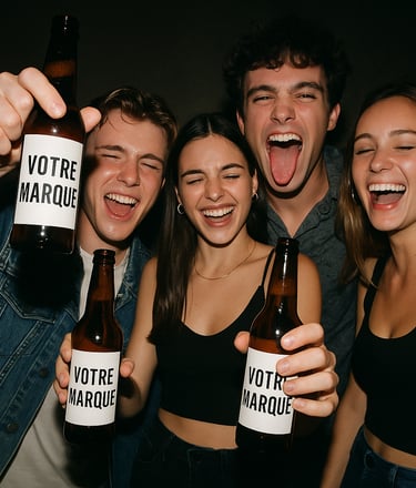 Vous choisissez un produit que nous fabriquons déjà (Limonade, thé blanc pêche, bière blonde 5%Alc ), vous nous transmettez votre design, et en quelques clics, votre boisson personnalisée est prête.